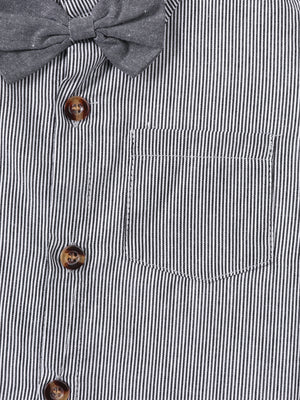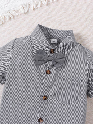 Un look chic e adorabile per ogni piccolo gentiluomo! Questo completo da bambino include una camicia a righe grigie con bottoni in legno e papillon coordinato, pantaloncini eleganti in tessuto leggero e comode bretelle elastiche regolabili. Perfetto per cerimonie, feste o shooting fotografici, questo outfit unisce stile classico e praticità. I tessuti morbidi e traspiranti garantiscono massimo comfort anche nelle giornate più calde.