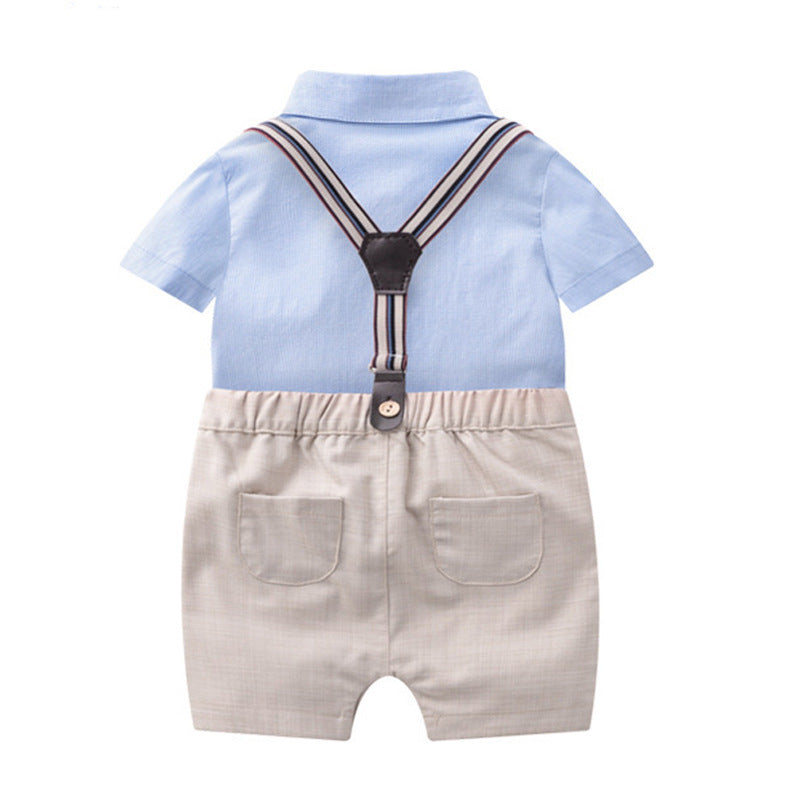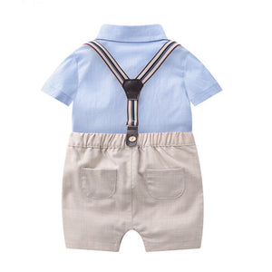 Un look da vero piccolo gentiluomo! Questo raffinato completo per neonato include una camicia celeste a maniche corte con papillon e pantaloncini beige con bretelle regolabili, per un outfit elegante e comodo allo stesso tempo.