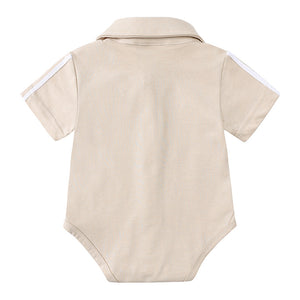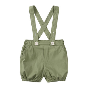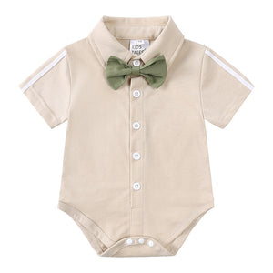 Perfetto per le occasioni speciali! Questo completo elegante per neonato include una camicina beige con colletto e maniche corte, un papillon in tono verde salvia e pantaloncini con bretelle coordinate. Lo stile retrò unito alla comodità dei tessuti rende questo outfit ideale per battesimi, matrimoni o feste estive.