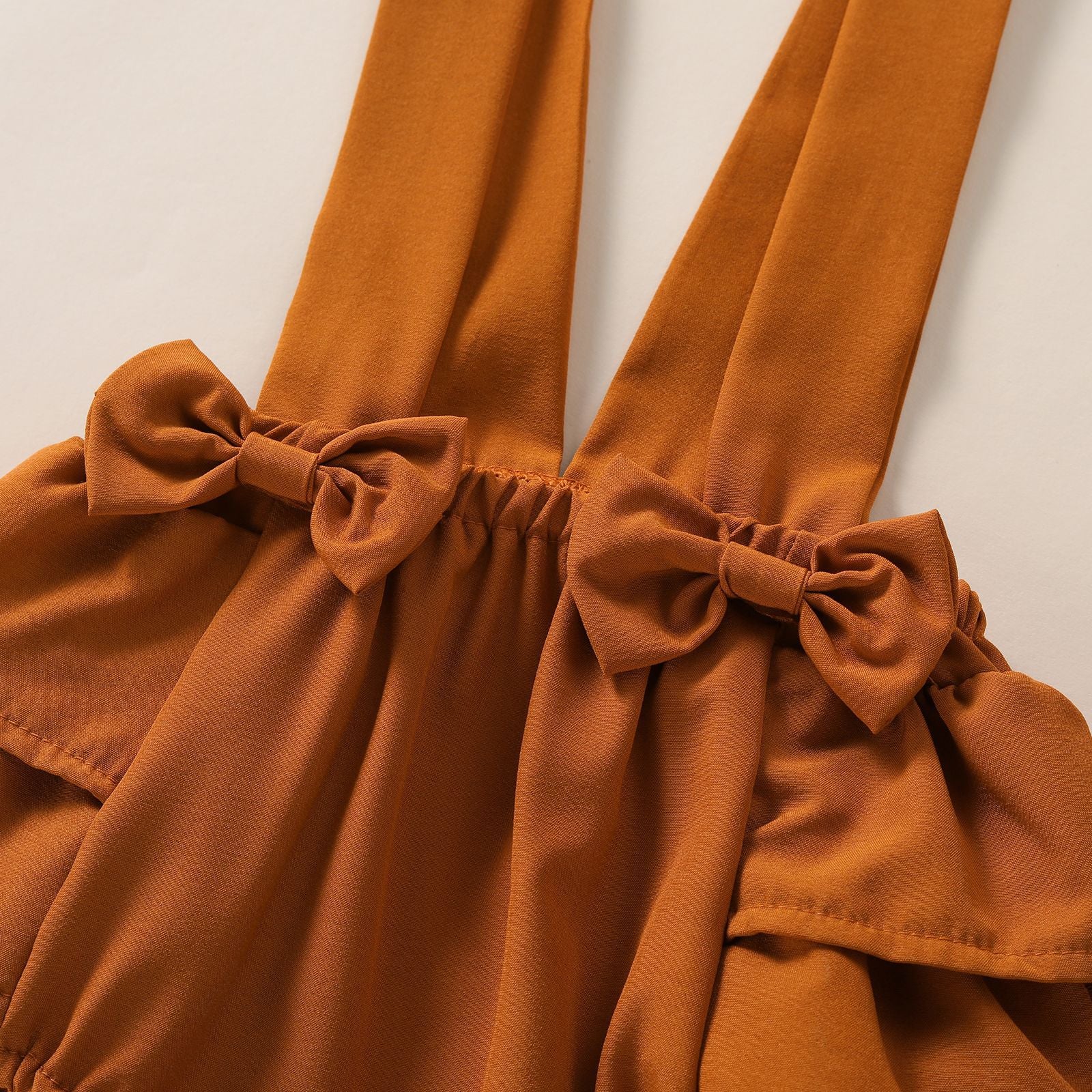 Completo Estivo 3 Pezzi Bimba – Top Bianco, Salopette Cognac e Fascia Fiocco
