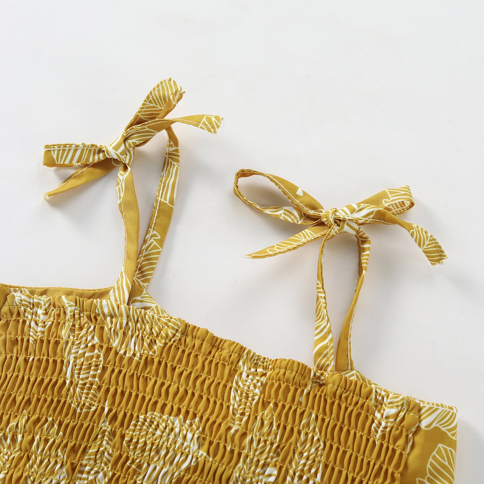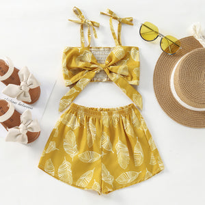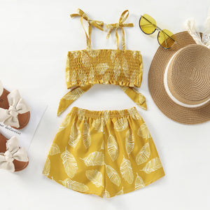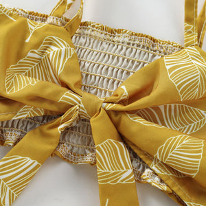 Un look perfetto per l’estate! Questo completo da bambina include un top crop smockato con fiocco frontale e spalline regolabili a fiocco, abbinato a shorts larghi e comodi con elastico in vita. La vivace stampa tropicale a foglie bianche su fondo senape rende l’outfit fresco e allegro, ideale per giornate di sole, vacanze o passeggiate in città.
