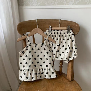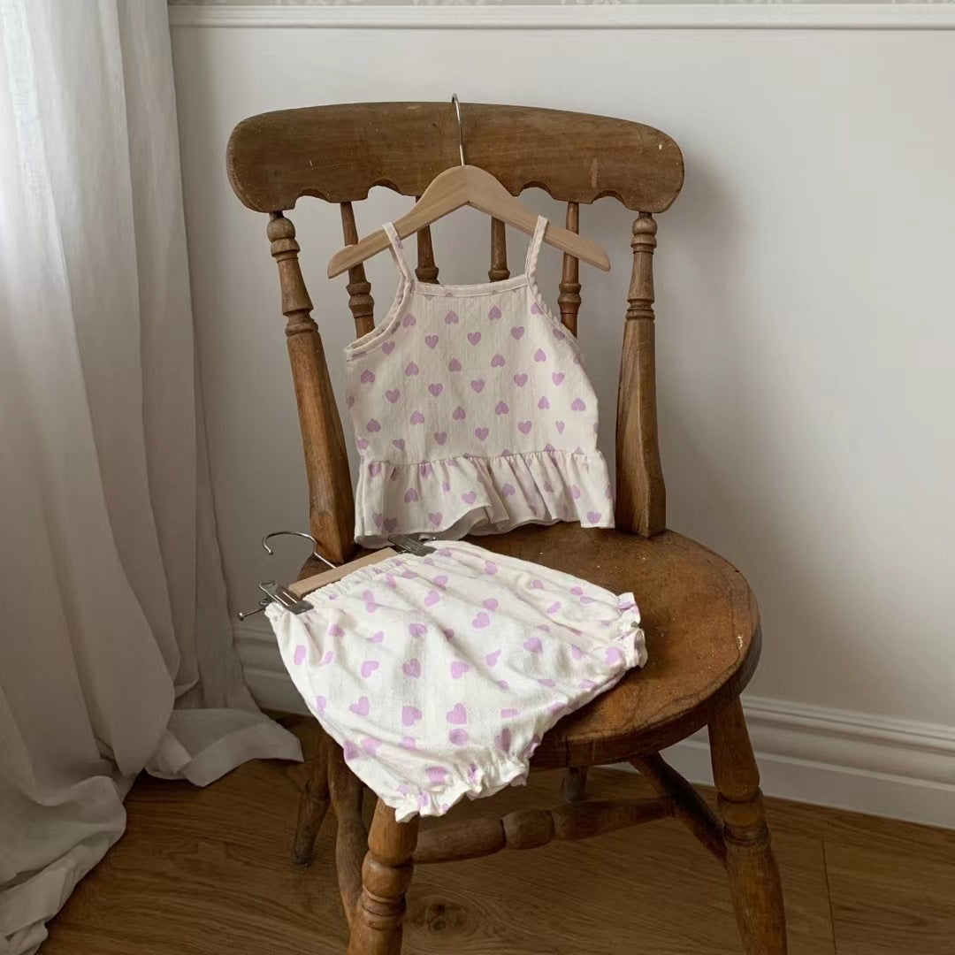 Leggero e adorabile, questo completo estivo per bambina è composto da una canottiera con spalline sottili e volant sul fondo, abbinata a shorts con elastico in vita e alle gambe. Il tessuto color panna è decorato con una dolce fantasia di cuoricini lilla, perfetta per le giornate calde all’insegna della comodità e dello stile. Ideale per giocare, uscire o rilassarsi a casa con un look fresco e romantico.