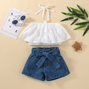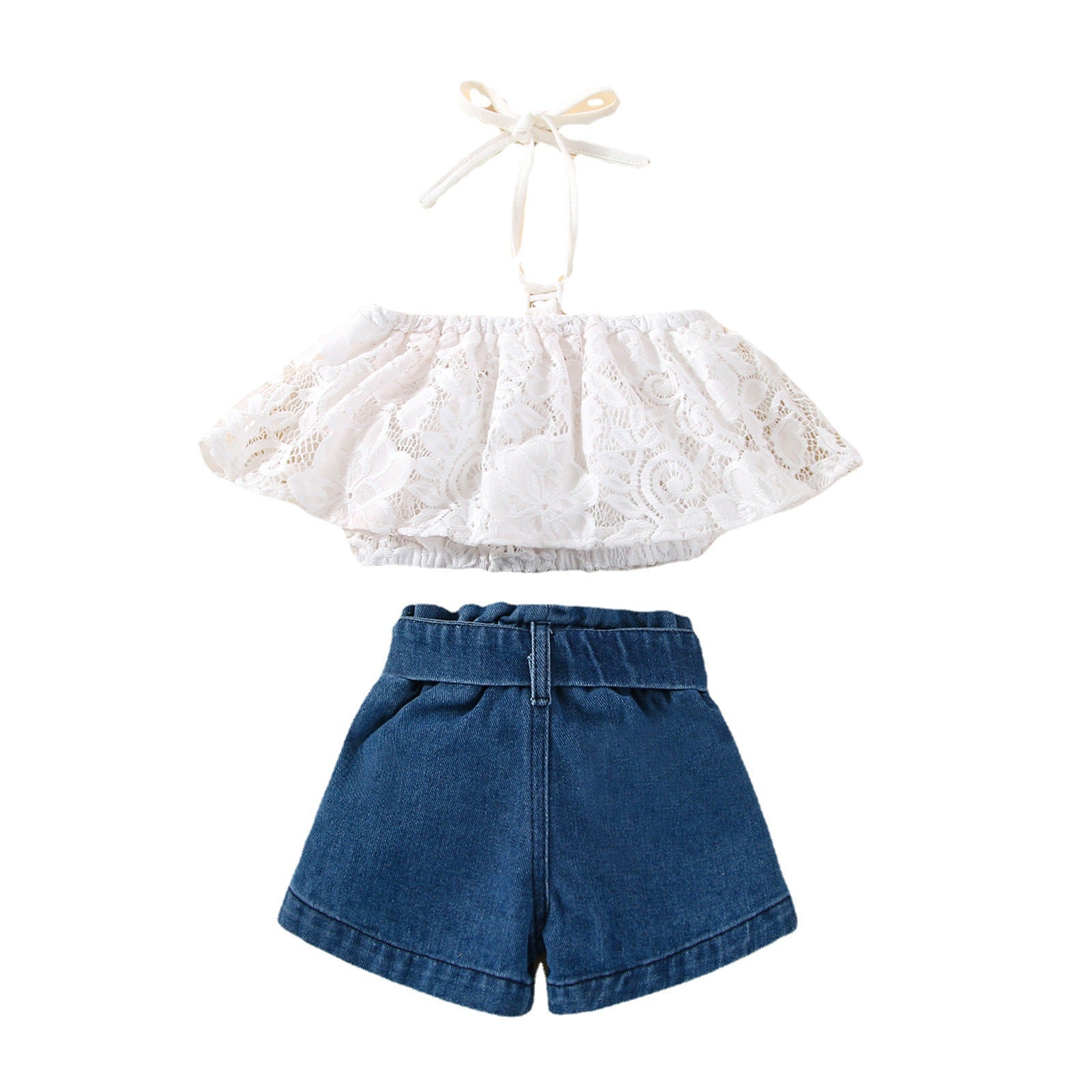 Home Completo estivo bambina con top in pizzo e shorts in denim