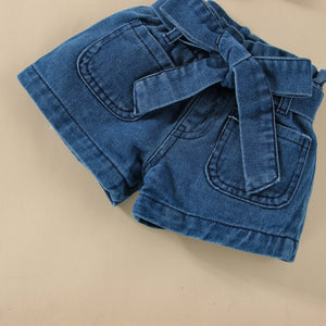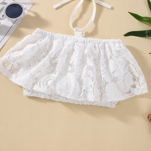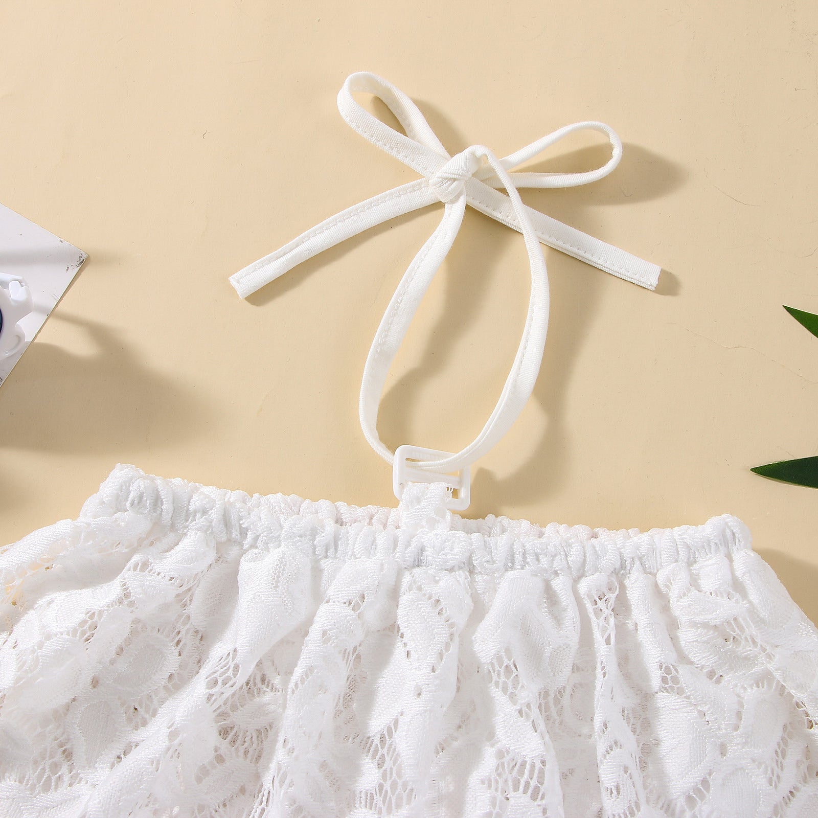Femminile, fresco e alla moda: questo completo estivo da bambina è composto da un top bianco in pizzo floreale con spalline da annodare al collo e da un paio di shorts in denim con cintura a fiocco. Il top leggero e traforato dona un tocco romantico, mentre i pantaloncini con vita arricciata garantiscono comfort e stile. Perfetto per giornate calde, passeggiate estive o eventi all’aperto. Un outfit che unisce praticità e dolcezza!