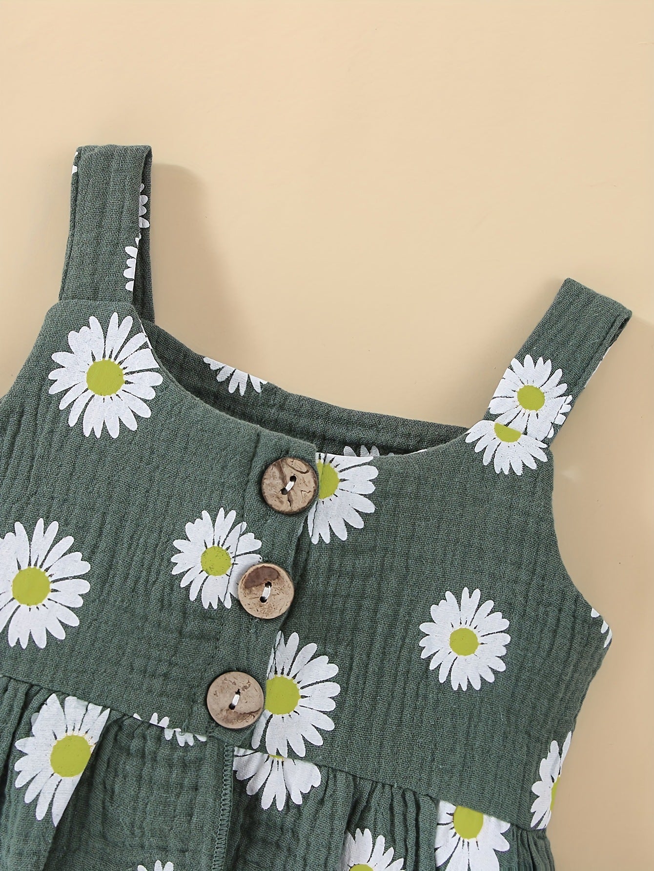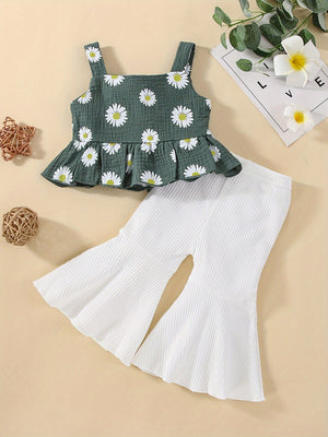 Vivace, comodo e super trendy! Questo completo estivo per bambina è composto da un top verde scuro a spalline con stampa di margherite e bottoncini decorativi, abbinato a pantaloni bianchi a costine con taglio a zampa. Perfetto per creare outfit originali e alla moda, ideali per passeggiate, feste e giornate di sole!