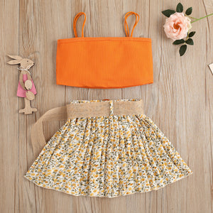 Completo estivo bambina – Top arancione e gonna floreale con cintura
