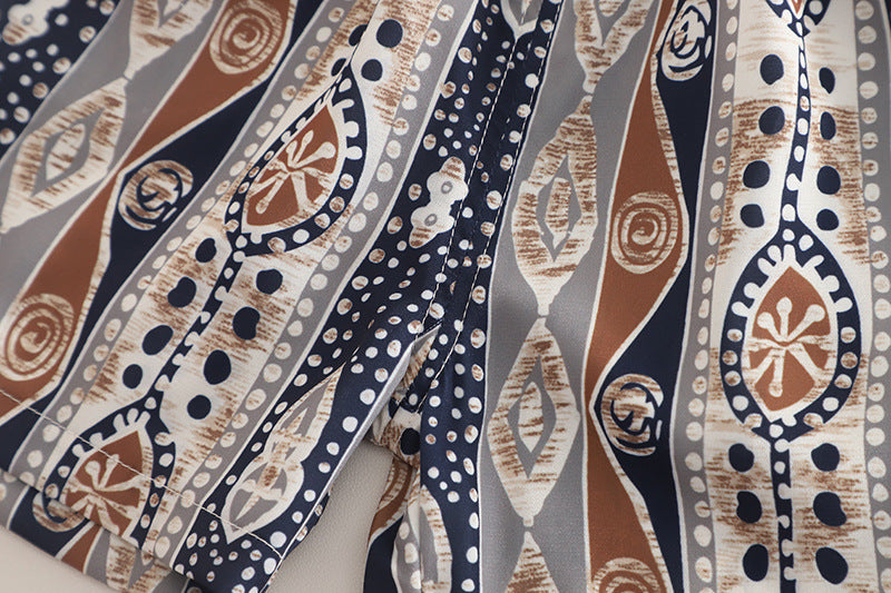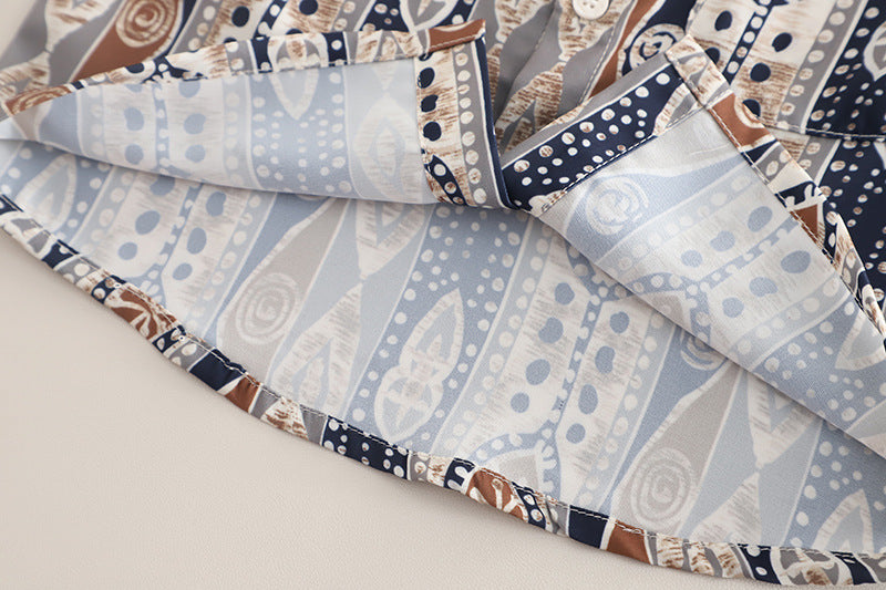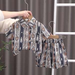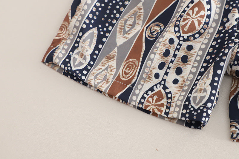 Il set comprende una camicia a maniche corte con colletto e taschino, abbinata a shorts con vita elasticizzata, entrambi decorati con una raffinata stampa etnica nei toni del marrone, beige e blu.