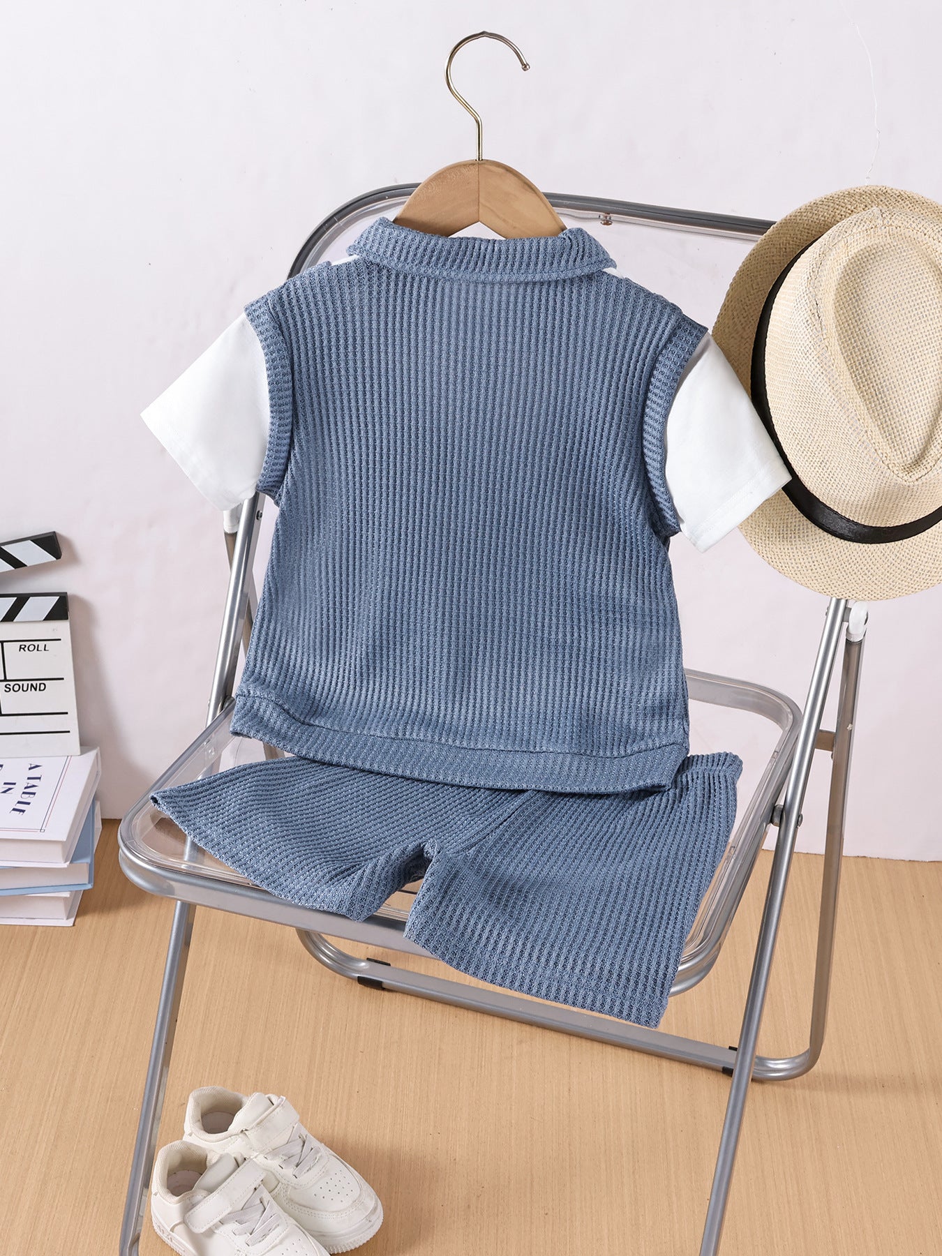 Questo raffinato set da bambino è l’ideale per chi cerca uno stile elegante e confortevole anche d’estate. Il completo è composto da una polo bianca a maniche corte e un gilet smanicato in maglia leggera blu, abbinati a shorts coordinati. Il design classico con colletto a camicia e il tessuto traspirante rendono questo outfit perfetto per cerimonie, feste o uscite chic. Un look sofisticato e allo stesso tempo pratico.