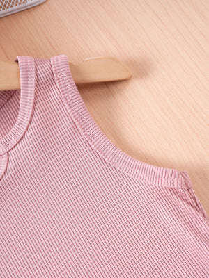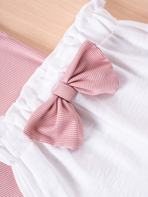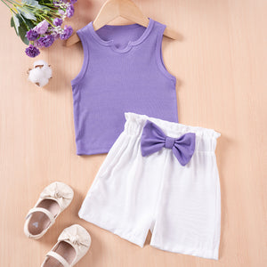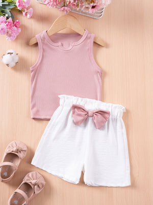 Delizioso completo estivo per bambina composto da canottiera rosa cipria in morbido tessuto a costine e shorts bianchi leggeri con maxi fiocco in tinta. Il top presenta un elegante dettaglio smerlato sullo scollo, mentre i pantaloncini hanno una fascia elastica in vita per il massimo comfort. Un outfit fresco, raffinato e comodo, perfetto per passeggiate, cerimonie estive o giornate speciali all’aperto.