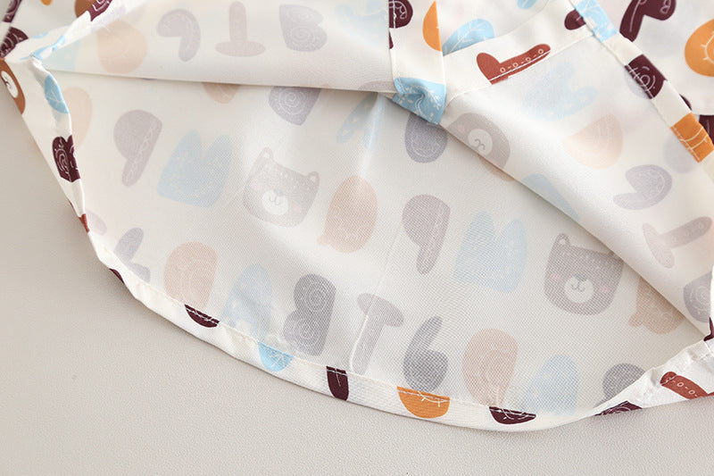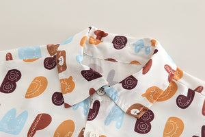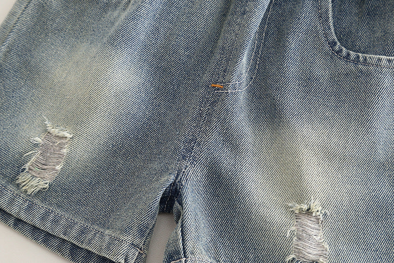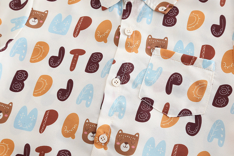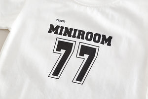 Look casual e allegro per i più piccoli! Il completo include una t-shirt bianca con stampa "Minirroom 77", una camicia aperta a maniche corte con simpatica fantasia colorata e un paio di pantaloncini in jeans effetto strappato. Ideale per la primavera e l’estate, questo outfit unisce comfort, stile e praticità.