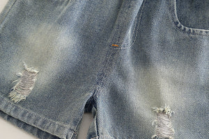 Completo Estivo Bimbo 3 Pezzi: Camicia Fantasia + T-Shirt + Shorts in Jeans