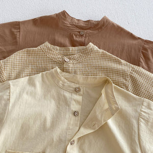 Leggerezza, stile e praticità si uniscono in questo set estivo per bimbo! Un completo composto da camicia con colletto coreano e pantaloncini in cotone traspirante, disponibile in tre deliziose varianti: crema, quadretti gialli e nocciola.