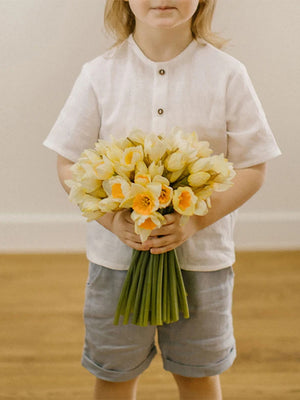 Fresco, elegante e confortevole: questo completo estivo da bambino è perfetto per ogni occasione speciale. Composto da una camicia in lino bianco a maniche corte con raffinata abbottonatura frontale in legno e da pantaloncini grigio chiaro con risvolto, unisce semplicità e stile in un unico outfit. Ideale per cerimonie, giornate estive o semplici momenti da ricordare. Realizzato in tessuti leggeri e traspiranti, garantisce libertà di movimento e massimo comfort.