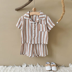 Completo Estivo Bimbo Marrone a Righe Camicia e Shorts Coordinati