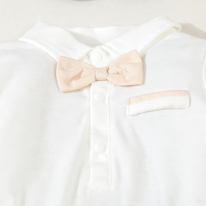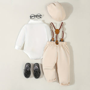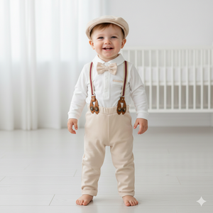 Il set include un raffinato body camicia bianco con maniche lunghe e papillon coordinato, pantaloni beige con pratiche bretelle elastiche regolabili, e un elegante cappellino in tinta. Ideale per cerimonie, battesimi, matrimoni o shooting fotografici.