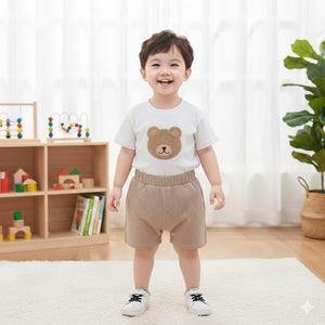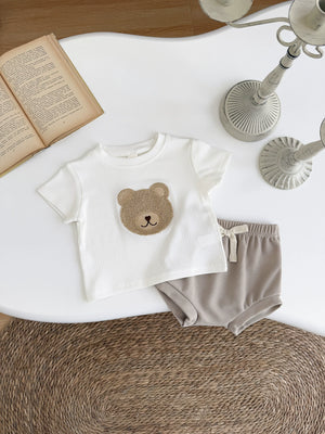 Completo estivo adorabile composto da magliettina in costina panna con ricamo orsetto in rilievo e shorts morbidi color tortora. Il tessuto leggero e traspirante è ideale per le giornate calde, offrendo comfort e libertà nei movimenti. Perfetto per un look fresco, semplice e super tenero.