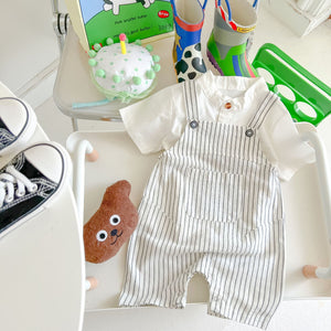 Descrizione: Elegante completo per bambini composto da una camicia bianca con bottoni in legno e una salopette a righe verticali in tonalità neutre. La camicia presenta un design minimalista con taschino frontale, mentre la salopette offre un look moderno e confortevole. Realizzato in tessuti leggeri e traspiranti, è perfetto per giornate estive, passeggiate o eventi casual. Un outfit che combina stile e comodità per i più piccoli!