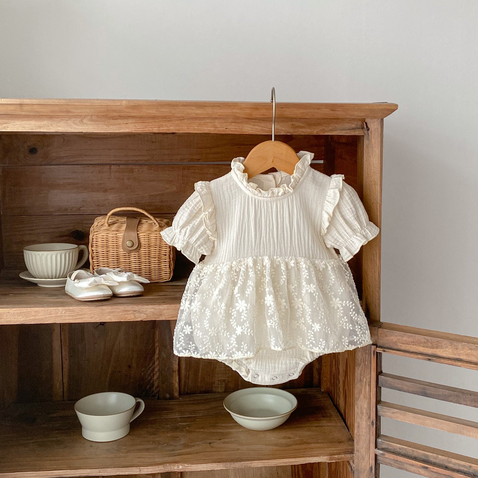 Home Pagliaccetto Neonata/ Bimba in Mussola con Gonna Ricamata – Modello Fiorellini