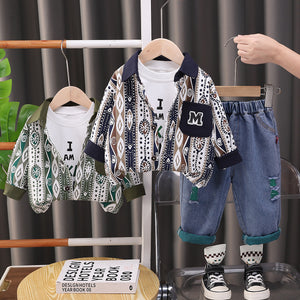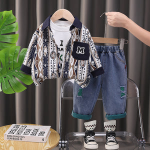• Set 3 pezzi: Giacca stampata + T-shirt + Jeans strappati