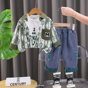 • Un completo allegro e grintoso perfetto per piccoli esploratori! Il set include una giacca fantasia in stile etnico, una t-shirt bianca con scritta e jeans denim con strappi e risvolto a contrasto. Disponibile in due varianti colore (verde oliva e marrone/blu), questo look è ideale per tutte le avventure quotidiane con un tocco di originalità.