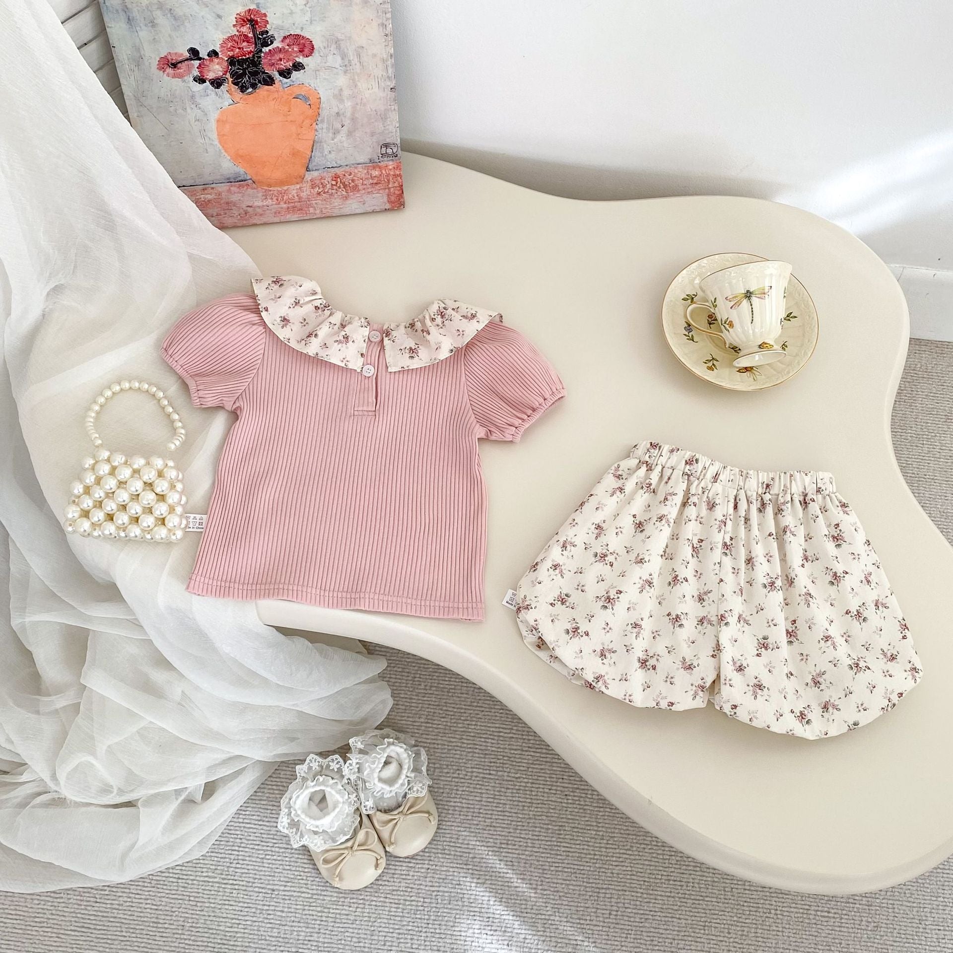 Completo Romantico Bimba  Maglietta Rosa con Colletto a Fiori e Shorts Coordinati