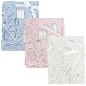 Morbida copertina per neonato in maglia lavorata, ideale per coccolare il tuo bimbo fin dai primi giorni. Elegante design traforato con fiocco in raso, perfetta per la culla, il passeggino o i momenti di nanna. Disponibile nei delicati colori azzurro, rosa e panna. Un prodotto raffinato e pratico