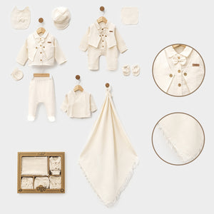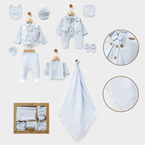 Un corredino raffinato e completo, realizzato in morbida mussola di cotone traspirante, perfetto per la pelle delicata del neonato. Il set è composto da 10 pezzi coordinati: