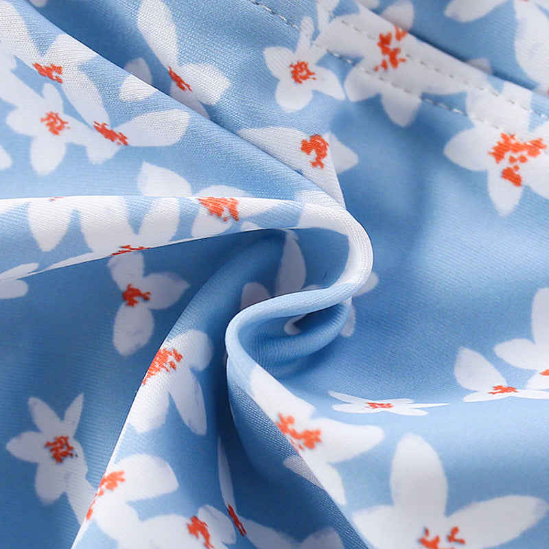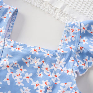 Questo costume baby azzurro a fantasia floreale conquista con i suoi dettagli romantici: spalline arricciate, fiocco centrale e una cuffietta coordinata per un look da piccola sirena 🌸🌊