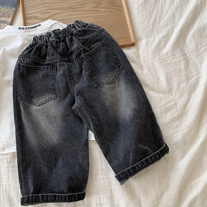 Jeans Bambino Nero Vintage con Strappo e Dettagli Asimmetrici