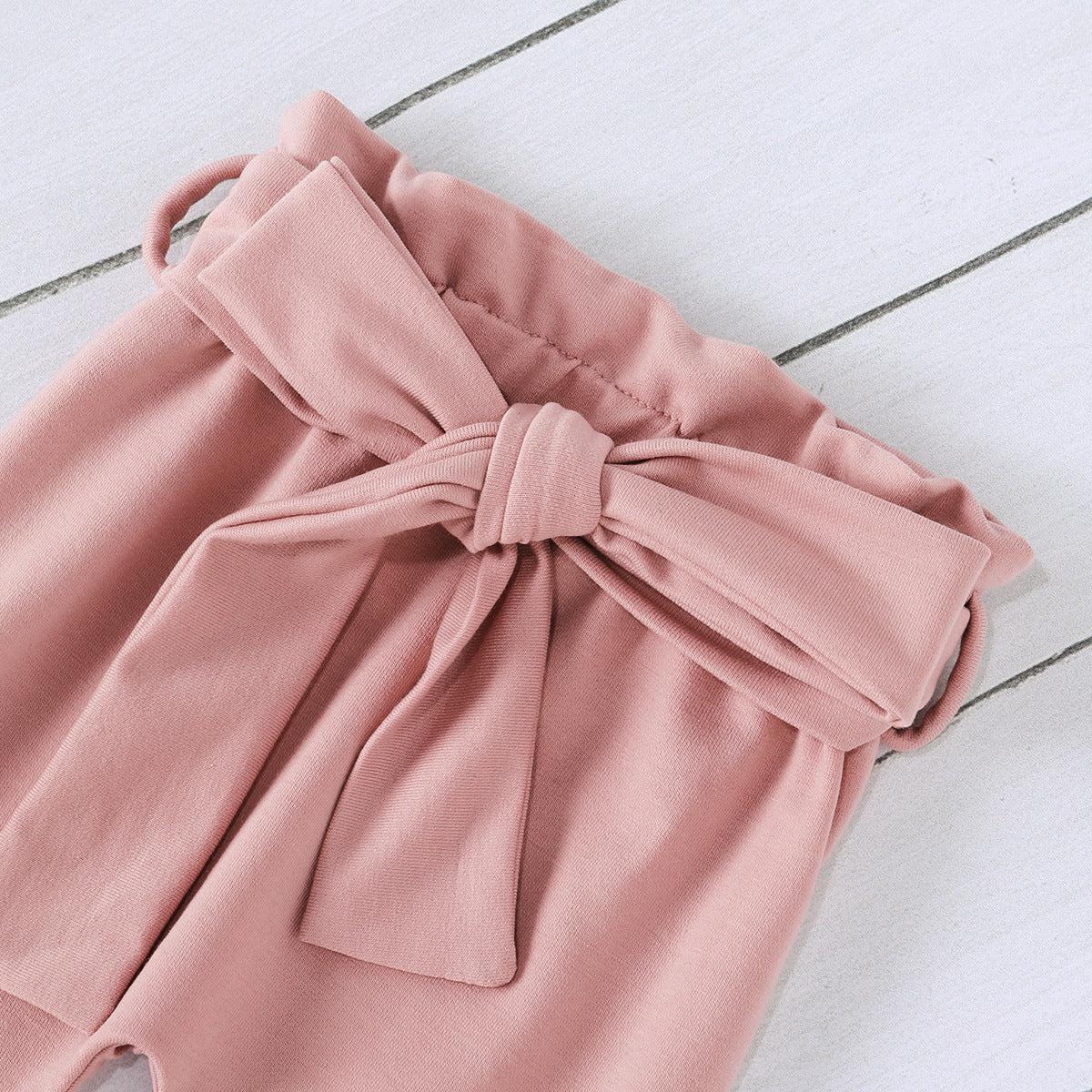 π Pantaloni rosa cipria con fiocco in vita e orlo risvoltato, elastico e pratico.