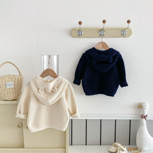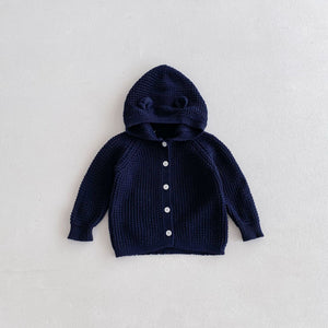 Dolcezza e calore in un unico capo! Questo cardigan per neonato è realizzato in morbida maglia di cotone a trama fitta, perfetto per le mezze stagioni o per l’inverno in abbinamento ad altri strati. Il cappuccio è arricchito da due tenerissime orecchiette per un look adorabile, mentre la chiusura frontale con bottoni rende il capo pratico da indossare. Disponibile in due varianti colore: panna delicato e blu navy elegante. Un capo versatile, caldo e irresistibilmente tenero!
