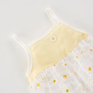 Fresco, dolce e perfetto per l'estate! Questo pagliaccetto con spalline sottili è decorato con una delicata margherita ricamata sul petto e una vaporosa gonnellina in tulle bianco con pois gialli effetto fiorellino. Il corpetto in tessuto a costine color pastello dona morbidezza e comfort alla pelle delicata della tua bimba. Ideale per le giornate calde, cerimonie o servizi fotografici, unisce praticità e stile in un unico capo. Dotato di bottoni a pressione sul fondo per un cambio semplice e veloce.