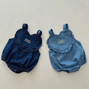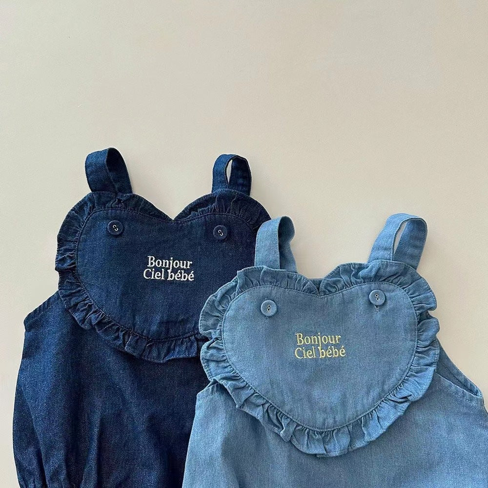 💙 Stile e dolcezza in un'unica salopette! Questo pagliaccetti  in denim è perfetto per un look casual. Con un cuore ricamato "Bonjour Ciel Bébé" e volant delicati, è l’outfit ideale per il comfort quotidiano della tua piccola. Realizzato in morbido cotone denim, garantisce una vestibilità comoda e traspirante.
