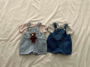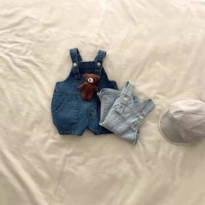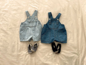 Set di salopette in denim per bambino disponibile in due varianti di colore: denim chiaro e denim scuro. Realizzate in tessuto resistente, queste salopette offrono praticità e stile con spalline regolabili e tasche frontali. Ideali per un look estivo casual e comodo, perfette da abbinare a una t-shirt o una camicia leggera. Adatte per giornate all'aperto o momenti di gioco.