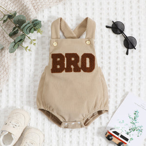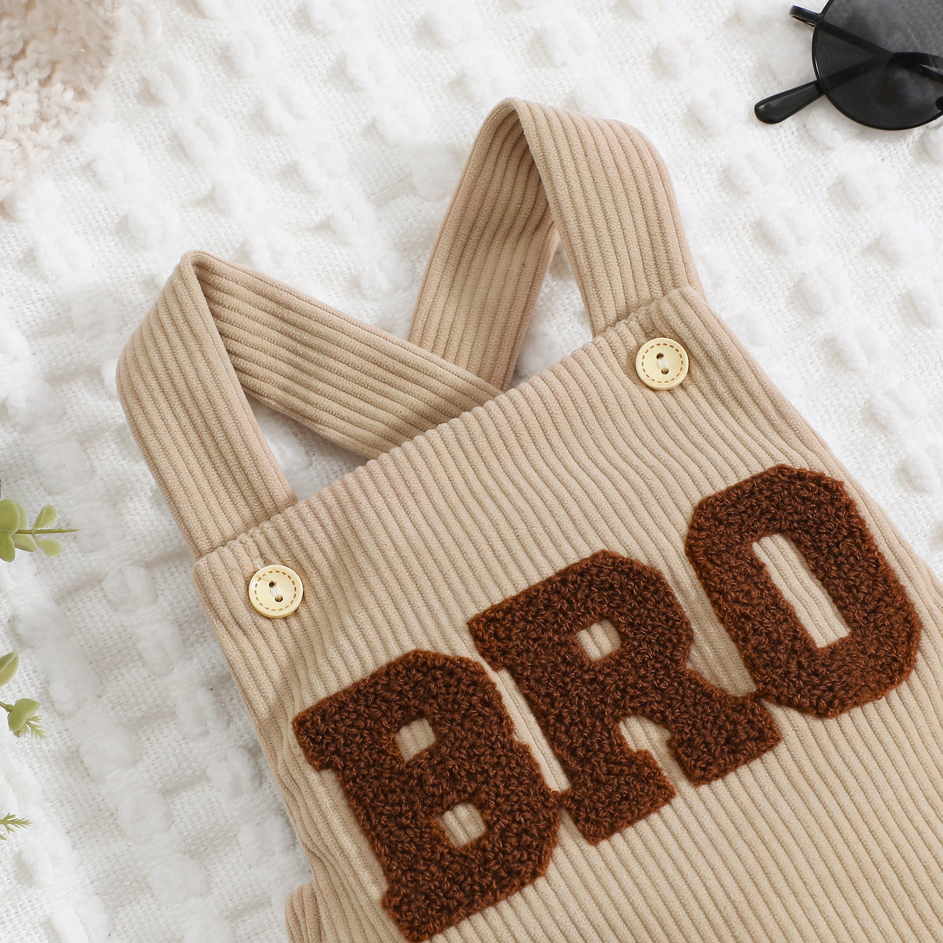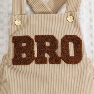Look super cool per il tuo piccolo fratellino! Salopette beige in cotone a costine con scritta “BRO” in spugna 3D. Comoda, trendy e perfetta per l’estate.