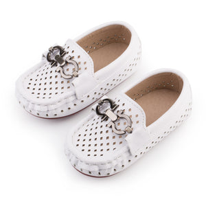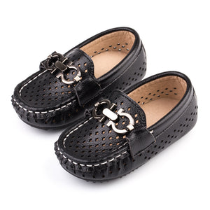 Dona un tocco di classe al look del tuo bambino con questi mocassini in pelle nera. Realizzati con materiali di alta qualità, presentano una lavorazione traforata per garantire traspirabilità e comfort durante tutta la giornata. Il design è impreziosito da una fibbia decorativa in metallo, perfetta per occasioni speciali o look casual chic. La suola flessibile e l’interno morbido assicurano una calzata comoda e sicura, ideale per i primi passi con stile.