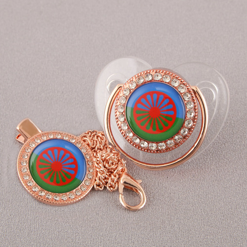 Un elegante set composto da ciuccio e catenella coordinata, decorati con cristalli scintillanti e il simbolo della bandiera colorata al centro.