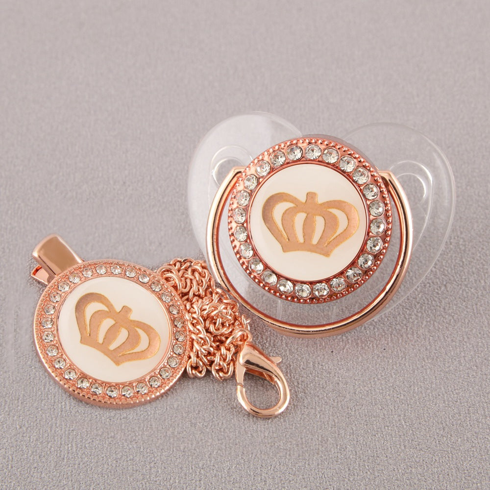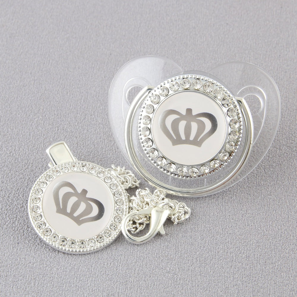 Set Ciuccio con Catenella e Copri-Polvere – Decorato con Corona e Cristalli (6-12 mesi)