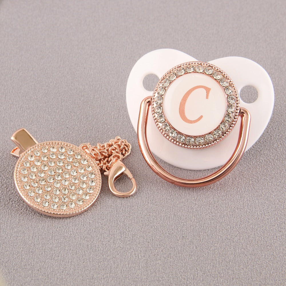 Un accessorio unico e raffinato: ciuccio con catena coordinata decorato con cristalli luminosi e l’iniziale personalizzata.