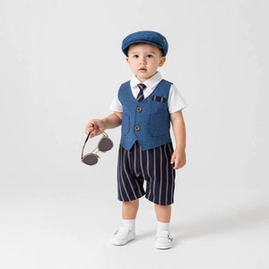 Questo set da cerimonia per neonato include una tutina con gilet blu , cravatta coordinata, cappellino in denim, calzettine e scarpine bianche con fibbia.