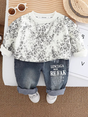 Look moderno e grintoso per i piccoli esploratori della città! Set composto da maglia a fantasia leopardata o tinta unita nera con catena decorativa e jeans denim con stampa "Lenciaga Mode Refak".