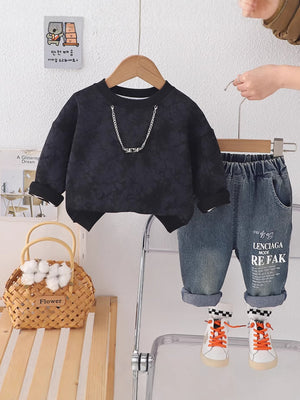 Completo Bambino Stile Urban con Maglia Stampata e Jeans con Scritta