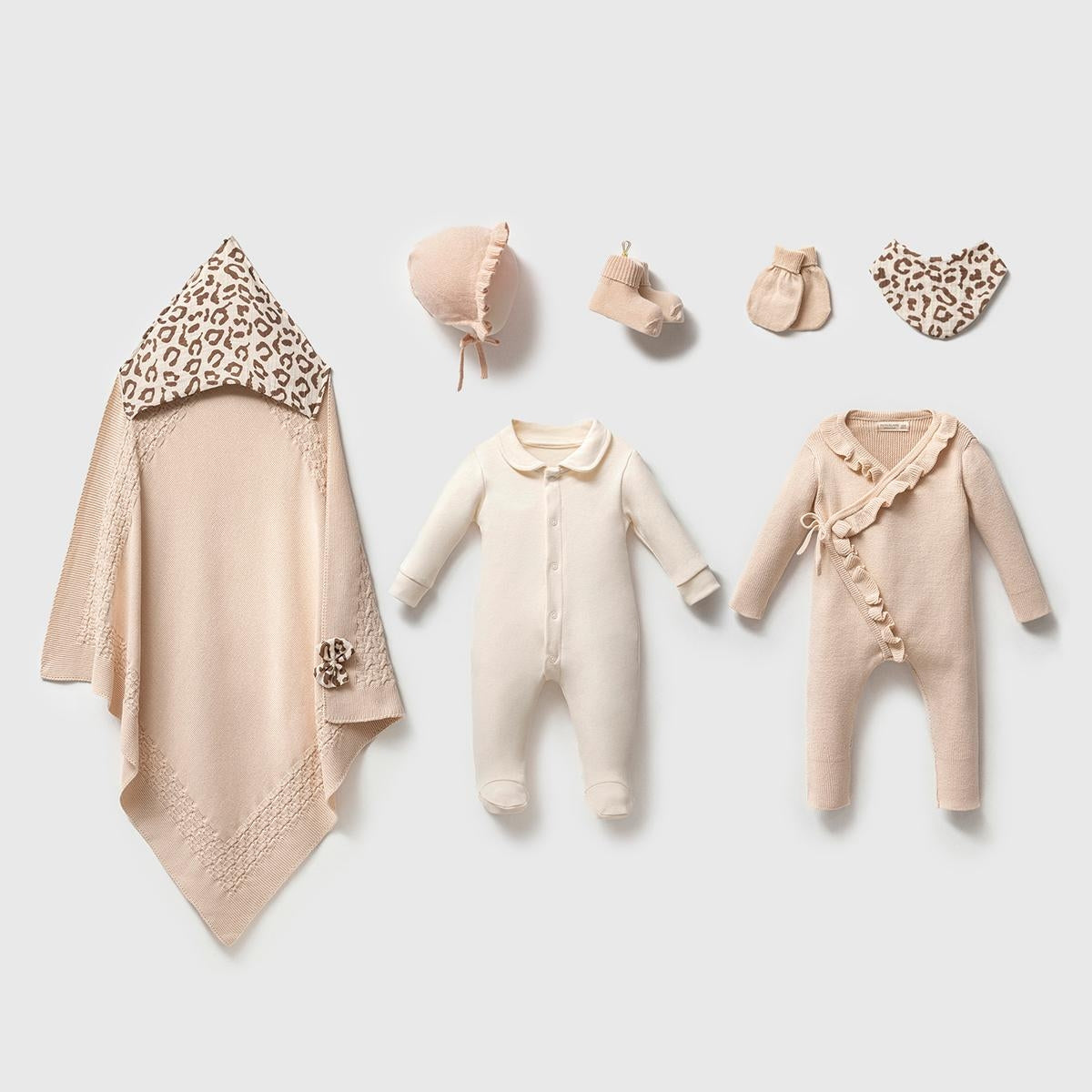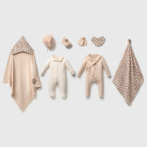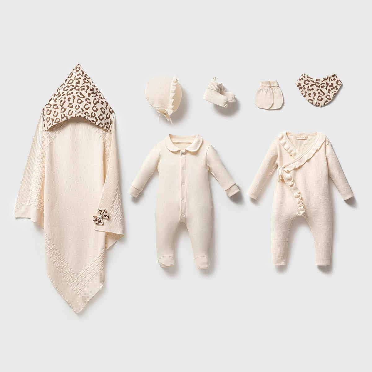 Set Nascita In Maglia Invernale 8 Pezzi Neonata Eleganza Safari con Dettagli Leopardati beige