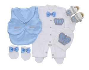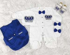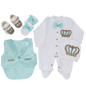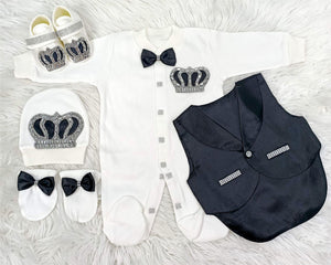 Set nascita principe – Tutina, gilet, scarpine e accessori con corona