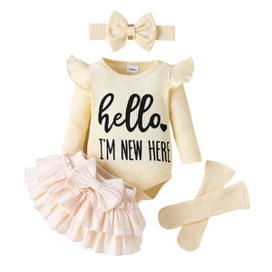 Presenta la tua piccola con stile con questo adorabile set neonata! Composto da un body rosa a maniche lunghe con scritta "Hello, I'm New Here", una gonna a balze con fiocco coordinato, una fascia per capelli abbinata e calzamaglia. Realizzato in tessuto morbido e confortevole, è perfetto per un look carino e accogliente in ogni occasione speciale. Il regalo ideale per celebrare l'arrivo di un nuovo membro della famiglia! 🎀💕