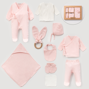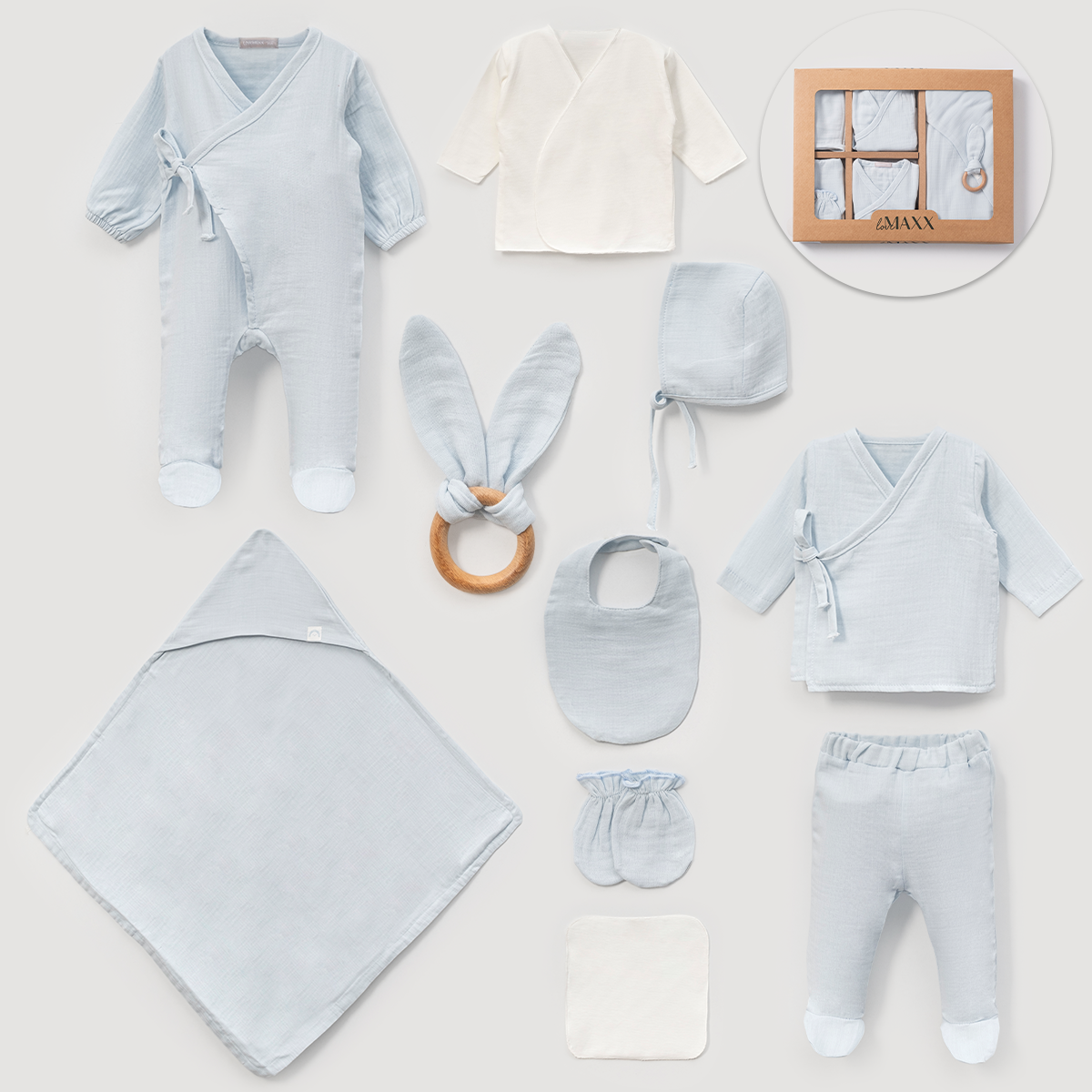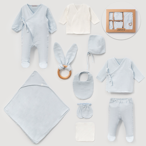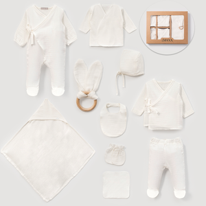 Un corredino elegante e naturale, realizzato in soffice mussola di cotone 100%, ideale per i primi mesi del tuo bebè. Il set da 10 pezzi unisce comfort, traspirabilità e uno stile minimal chic, perfetto sia per maschietti che per femminucce.