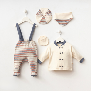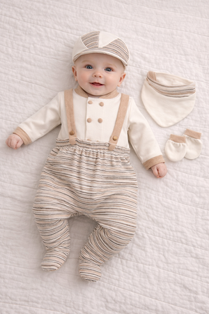 Set Neonato 5 Pezzi con Bretelle – Look Naturale Beige e Panna