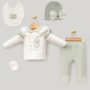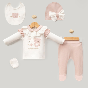 Un adorabile completo neonato da 5 pezzi, pensato per unire comfort e dolcezza nei primi mesi (0-3 mesi). Realizzato in cotone morbido e traspirante, è perfetto per la pelle delicata dei bebè. Il design con teneri orsetti ricamati e il colletto arricciato lo rendono ideale anche come regalo nascita.