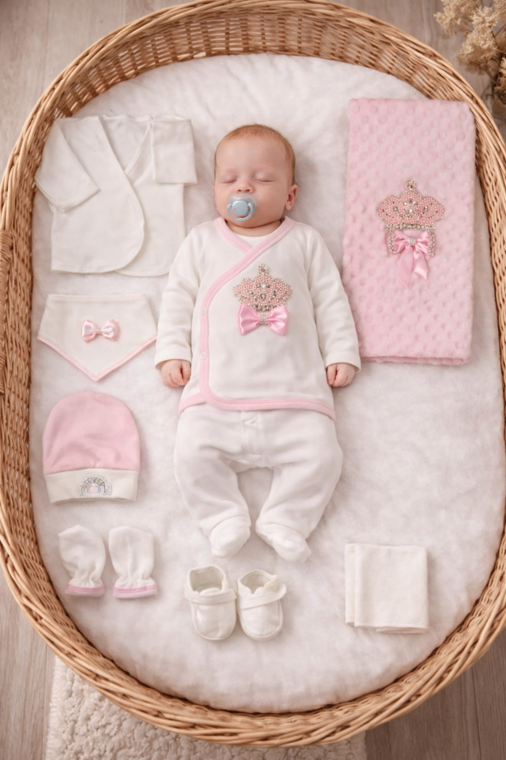 Delizioso set neonato da 0 a 3 mesi composto da 5 pezzi coordinati, ideale per accogliere il tuo piccolo con dolcezza e stile. Realizzato in morbido cotone traspirante, è perfetto per la pelle delicata del neonato. Include: