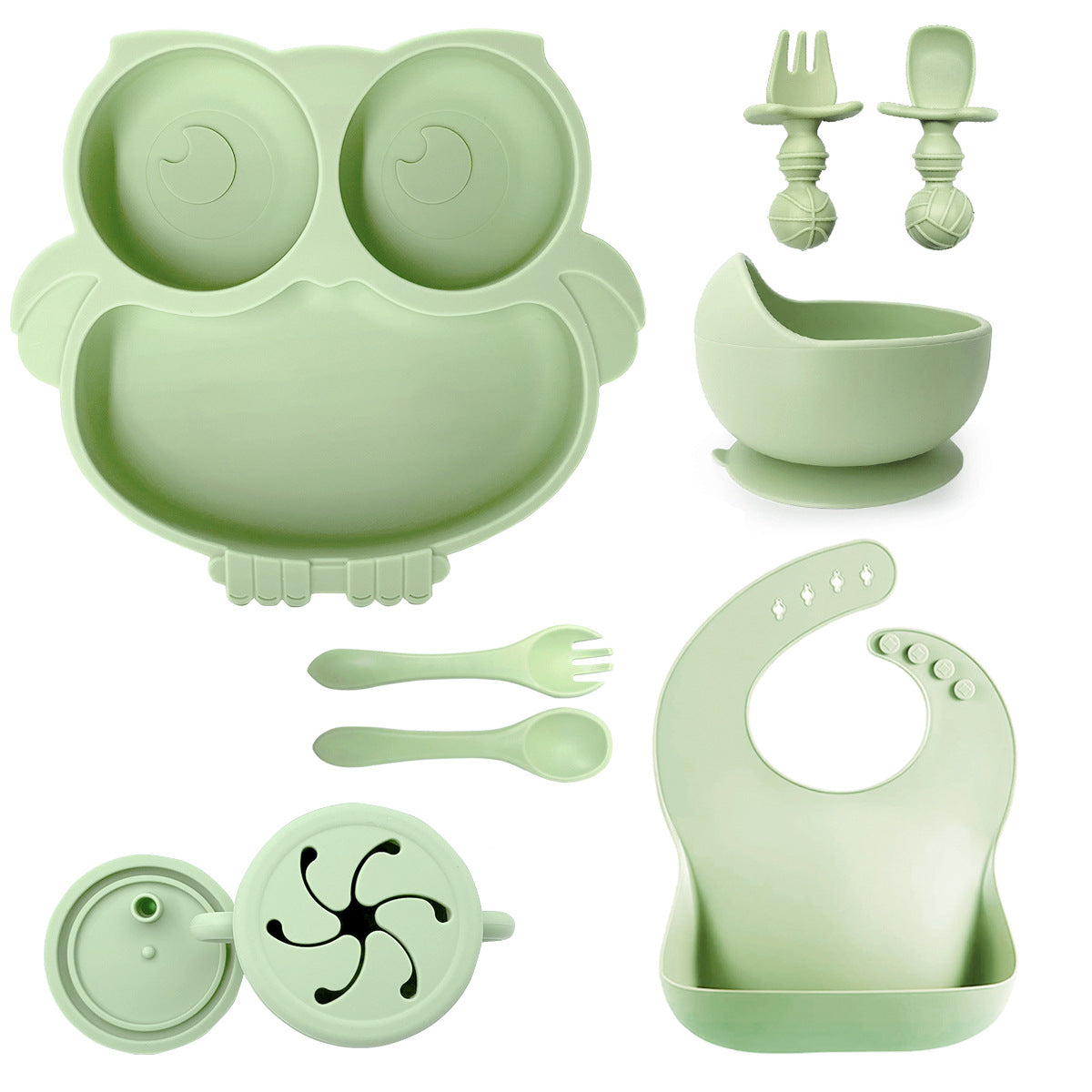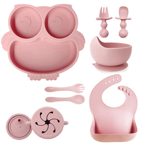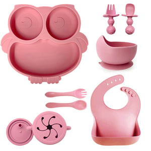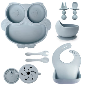 Rendi il momento della pappa più divertente e sicuro con questo adorabile set in silicone a tema gufo! Perfetto per lo svezzamento, include tutto il necessario per aiutare il tuo bambino a mangiare in autonomia: un piatto a forma di gufo con scomparti, una ciotola con ventosa, un bicchiere con cannuccia e manici, un bavaglino raccoglipappa e tre posate ergonomiche. Tutto realizzato in silicone alimentare, privo di BPA e facile da pulire.